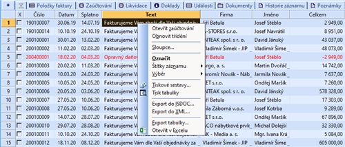 Stisknete-li v tabulce agendy pravé tlačítko myši a z místní nabídky zvolíte povel Export tabulky…, exportují se pouze vybrané záznamy dané agendy. Pokud uživatel nemá v agendě Přístupová práva ve větvi Soubor/Databáze zatrženou volbu Export, program mu neumožní provést daný povel.